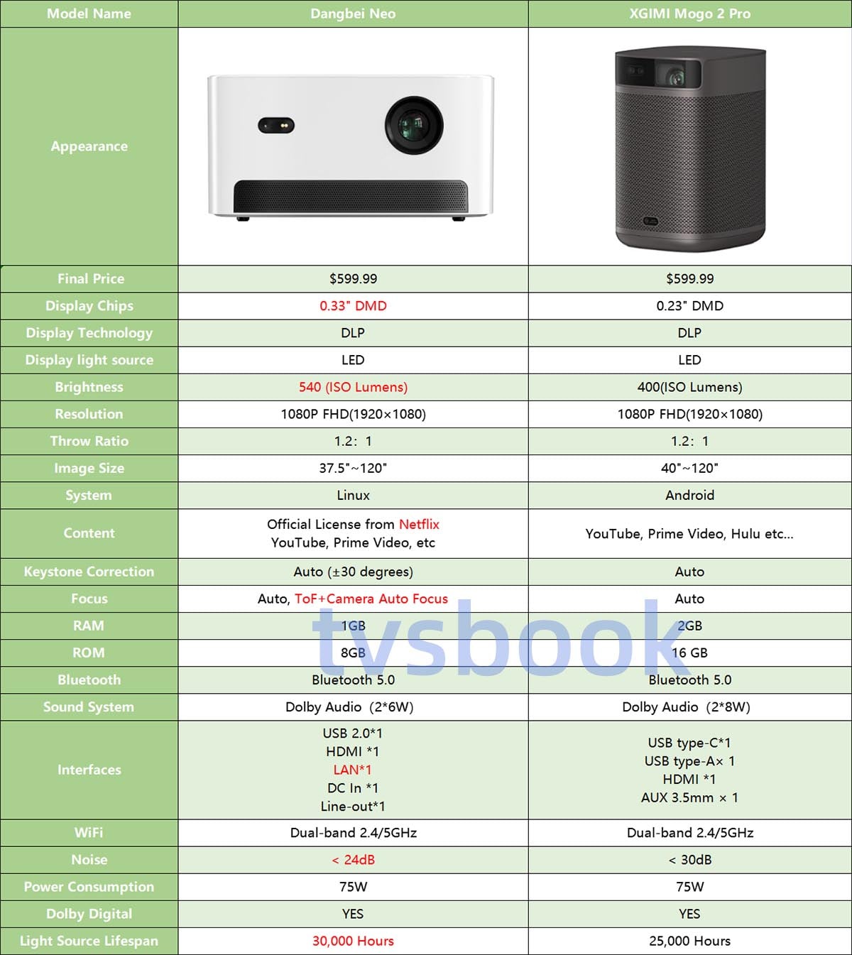 In addition, the Dangbei Neo has a 30,000-hour lifespan, compared to 25,000 Hours for the XGIMI Mogo 2 Pro, while the Dangbei Neo is quieter, providing a quieter viewing experience.