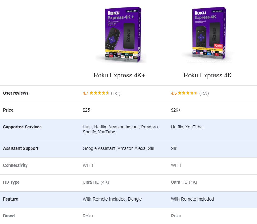 Roku also released Express 4K (no "+"). The biggest difference between the Roku Express 4K and the Roku Express 4K+ is the price and the remote that comes with each device. The Roku Express 4K+ comes with a voice remote with TV controls, while the Roku Express 4K comes with a simple remote without voice or TV controls. What's more, Roku Express 4K+ supports more streaming services.
