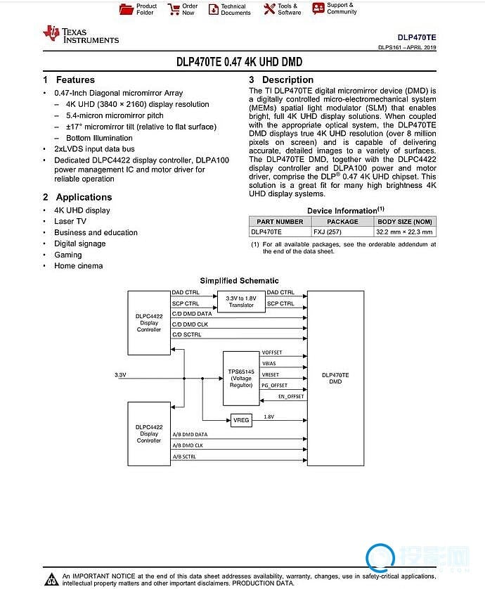 0.47 inch DMD 4K, this is a chip that has not been on the market for a long time. The original resolution of this chip is 1920X1080. TI is 4K achieved by using XPR technology, which is also known as "shake 4K" by some people. I wrote about it in the previous article, but I won't repeat it here. In Ti website also can check the two models, DLP470TP and DLP470TE model just sent a letter, but the gap between the actual performance is also very big, only 1500 lumens DLP470TP design maximum brightness, basic is only applicable to micro, and maximum lumen DLP470TE design can support to 4000 lumens, DLP470TE large-scale application in the 4 k of traditional home theater projectors models above, BenQ W1700, Optoma 528 etc. The machine is done with DLP470TE the DMD.